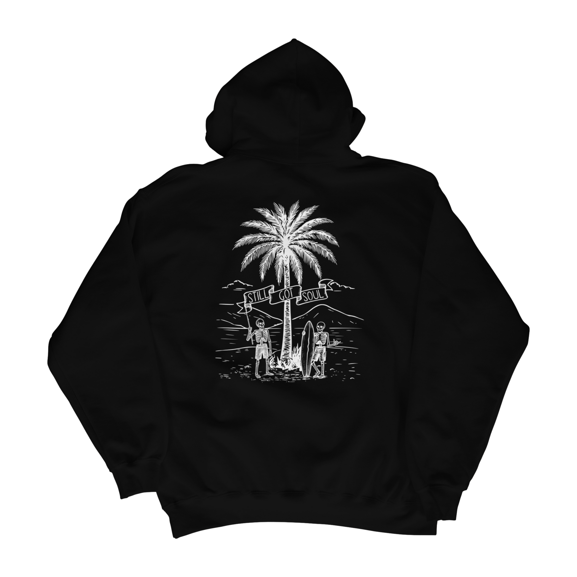 The Still Got Soul Hoodie is a playful reminder that no matter how much time passes soul never dies. Featuring two skeletons posted up beneath a palm tree with boards in hand, this design celebrates a life well-lived, and their spirit that never fades.